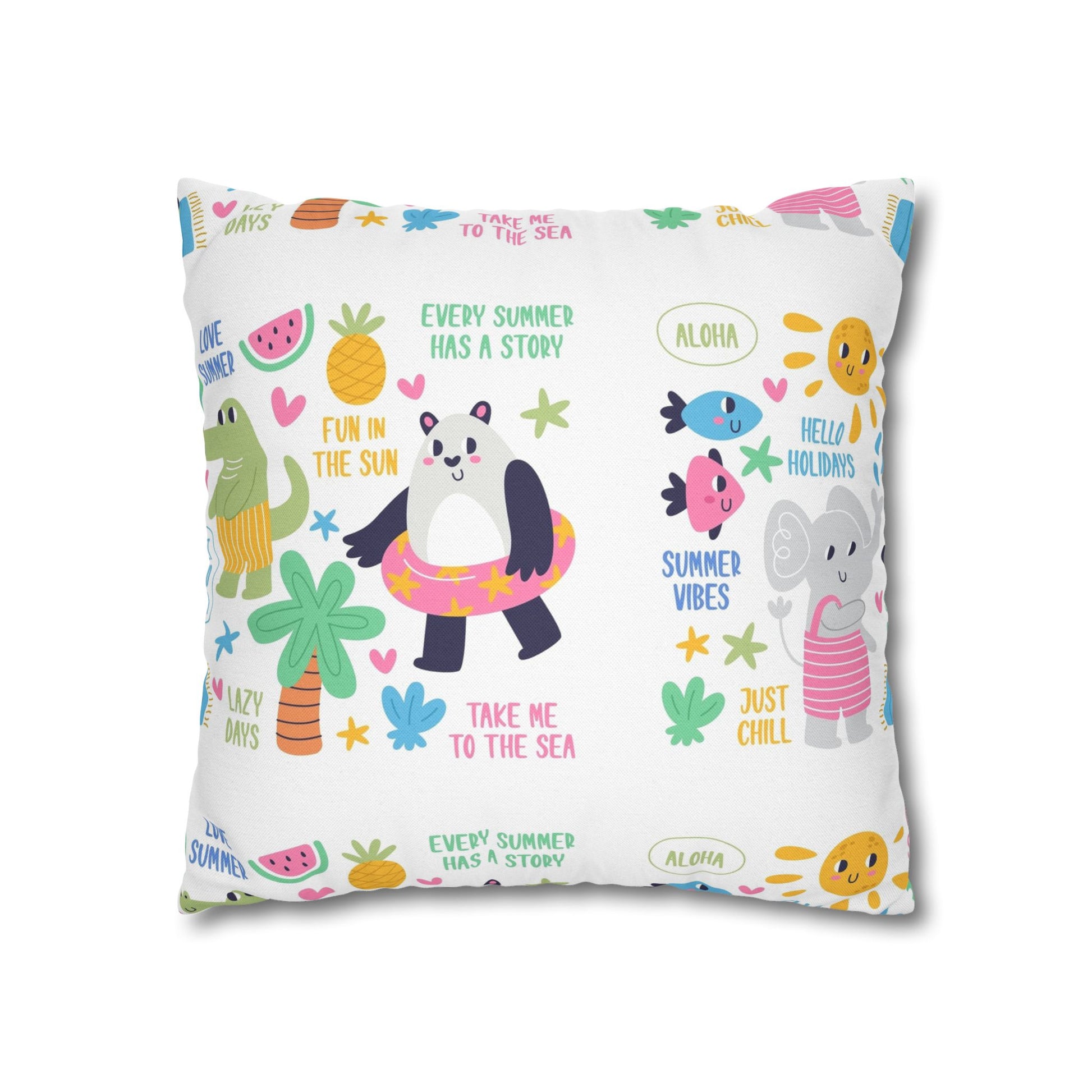 Bring a splash of playful summer joy to any room with this square pillowcase. Soft spun polyester keeps the bright, double-sided print crisp and smooth — no ironing needed. The design mixes cheerful animals, sunny icons, and upbeat phrases that feel like a kid’s day at the beach. A concealed beige zipper blends into the edge for a clean finish, while the lightweight, durable cover is easy to slip on and off when you want to change your decor. It’s an effortless way to add color and whimsy to a nursery, playroom, or cozy reading nook.